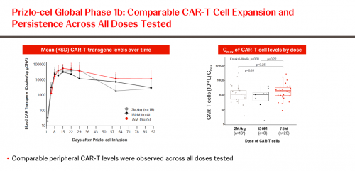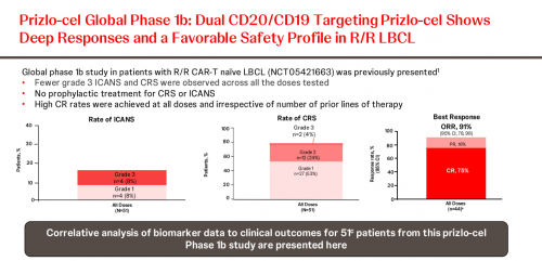 初步结果显示,在所有剂量水平下,既往未接受过CAR-T细胞治疗的患者的客观缓解率(OR)和完全缓解率(CR)分别为91%和75%;在推荐的2期剂量(RP2D),即7500万个CAR+T细胞,OR和CR率分别为96%和77%。在RP2D剂量组的25名患者中,未观察到3/4级细胞因子释放综合征(CRS),仅观察到1例3级免疫效应细胞相关神经毒性综合征(ICANS)。