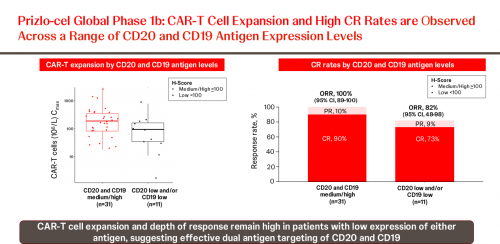 与T细胞毒性相关的细胞因子水平升高,与CRS或ICANS的发生时间相吻合,并且与严重程度分级相关。在评估的固定剂量中,RP2D剂量下的细胞因子中位水平总体较低。在达到CR的患者中,较高的CAR-T细胞峰值中位水平经过输注前肿瘤负荷的标准化处理。43名患者的肿瘤样本显示,基线CD20表达水平高(79%的患者H-score >200),但IHC检测的CD19表达存在差异。使用H-score截断值100,16%的患者靶抗原表达水平较低或异质:9%的患者CD20或CD19表达水平低,7%的患者两个靶抗原表达水平均低。在31名CD20和CD19均为高/中表达(H-score >100)的患者中,OR和CR率分别为100%和90%;而在11名至少有一种抗原低表达(H-score <100)的患者中,OR和CR率分别为82%和73%。
