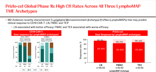 此外,LymphoMAP分析显示,在所有原型(包括以大量CD8+ T细胞和耗竭标记物为特征的TEX原型)中均观察到高缓解率。这表明,与先前已获批的CD19 CAR-T细胞疗法相比,JNJ-4496可能能够克服免疫抑制性TME,并提供改善的治疗反应。因此,这些初步发现可能解释了JNJ-4496在R/R LBCL患者中观察到的高临床缓解率,并将在本研究和未来研究招募的更多患者中进行进一步评估。